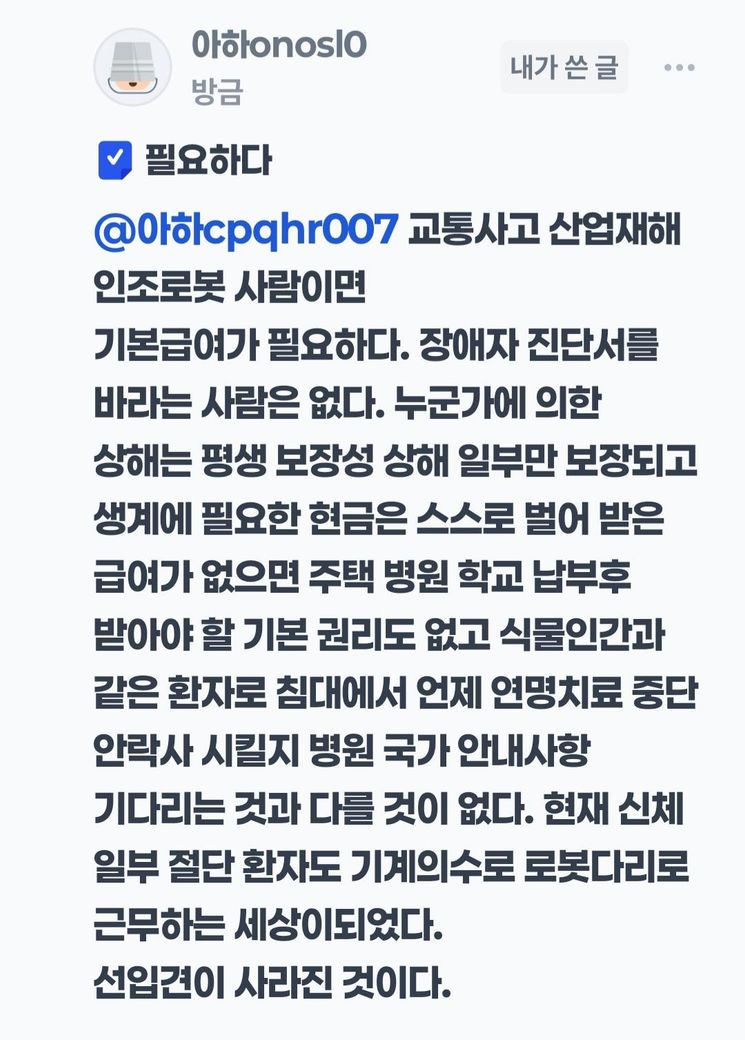 기본급여가 필요하다. 장애자 진단서를 바라는 사람은 없다. 누군가에 의한 상해는 평생 보장성 상해 일부만 보장되고 생계에 필요한 현금은 스스로 벌어 받은 급여가 없으면 주택 병원 학교 납부후 받아야 할 기본 권리도 없고 식물인간과 같은 환자로 침대에서 언제 연명치료 중단 안락사 시킬지 병원 국가 안내사항 기다리는 것과 다를 것이 없다. 현재 신체 일부 절단 환자도 기계의수로 로봇다리로 근무하는 세상이되었다. 선입견이 사라진 것이다.