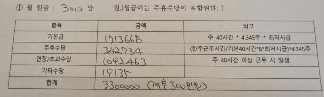 이는 세후 월 300만원의 계약을 했기 때문에 평균 일수를 기재한 것으로 사료됩니다