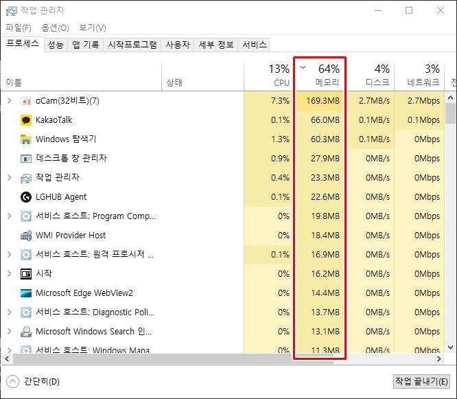 이런저런 방법 다 해봤는데 세부정보 svchost.exe 중에서도 system 되어 있는 걸 종료해야 램이 정상으로 돌아옵니다