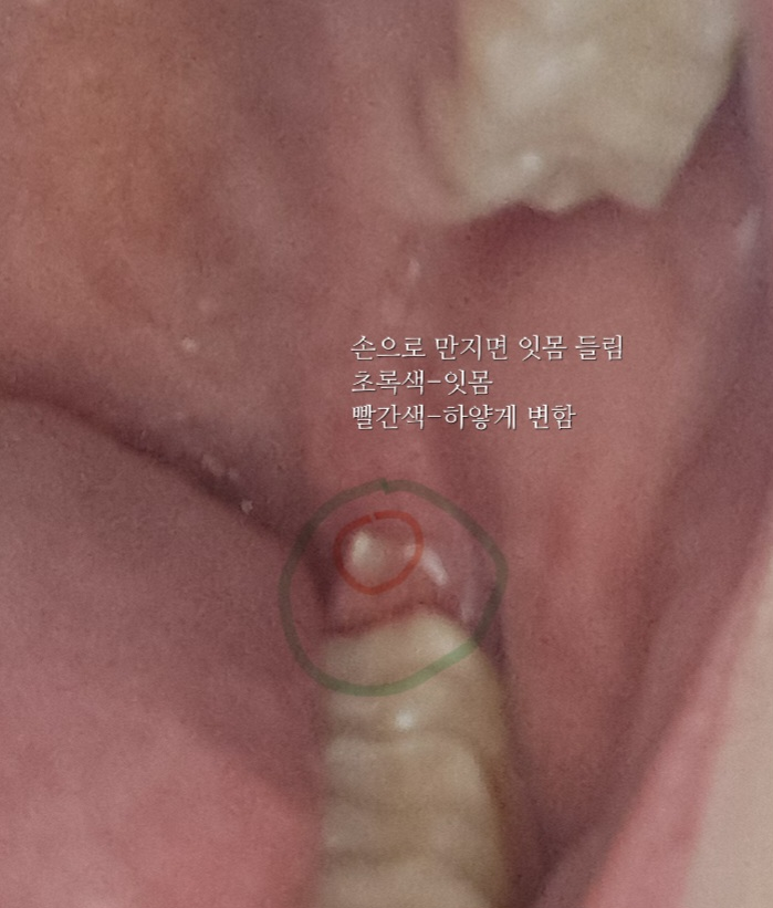 근데 왼쪽 잇몸은 건드려도 안아프고 잇몸을 들어도 금방 가라앉는데 저건(오른쪽) 들어도 몇초간 유지되어 있어요