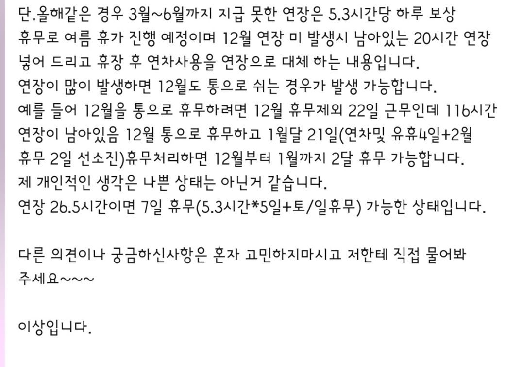 내용은 관리자가 직원들에게 카톡으로 공지한 내용입니다.. 저 내용으로 봐선 여태까지 쌓은 연장을 휴장기간에 대체한다로 보여지거든요..