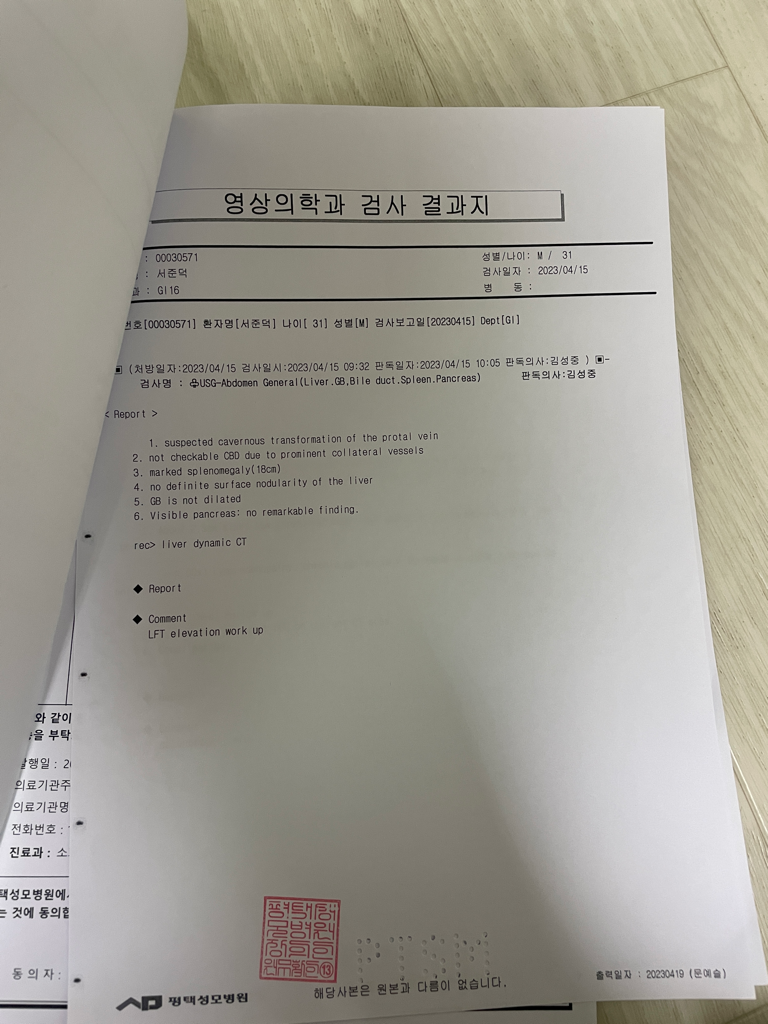 결론적으로 간세포암은 보이지 않으나 간경화로 인한 비장비대가 의심된다는 소견입니다.