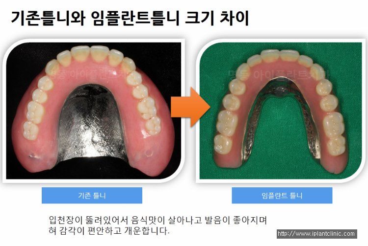 위쪽에 사용되는 전체 틀니의 경우 임플란트를 식립하지 않으면 입천장을 뚫을 수 없습니다. (뚫으면 틀니가 붙어있지 못하고 떨어집니다)