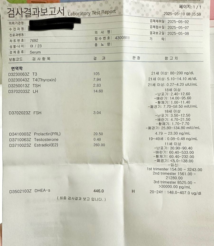 3월 21일이 마지막 생리 시작일이구요 평균 주기는 31일 생리는 7일동안 거의 규칙적인 편이였습니다 3월 27일에 끝났고 다음 생리 예정일은 4월 22일쯤이였는데 아직까지도 생리를 하지 않는 상황입니다 4월 18일부터 22일쯤까지 팬티라이너로 커버 되는 아주 소량의 부정출혈이 있었구요 4월 25일에 임테기 한줄 나왔고 이후 5월2일에 산부인과에 가서 초음파 검사, 호르몬 피검사(결과는 사진 첨부)까지 하고 5월 16일에 결과 듣고 별 문제가 없어서 소변 검사 후 임신 아닌 거 보시구 생리유도주사를 맞았어요