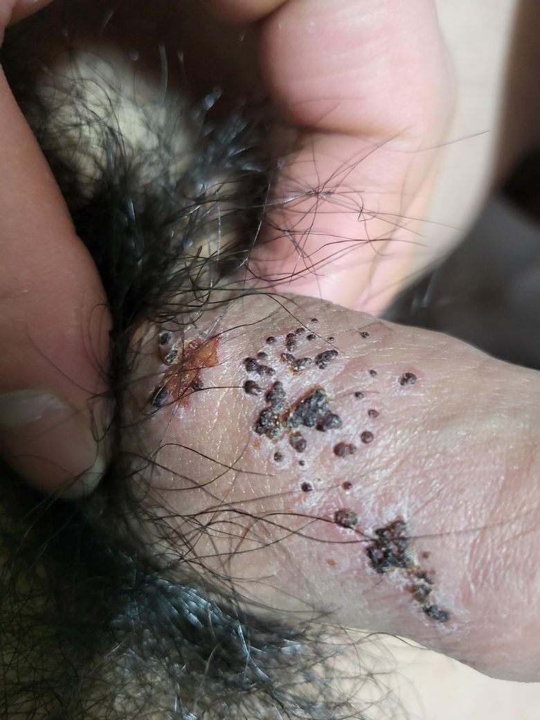 성기에 검은 반점이 생겼습니다 혹시 성병일까요? 일주일 전쯤부터 생겼고 시간이 지날수록 딱지가 생겨서 저렇게 까진 자국도 생겼습니다