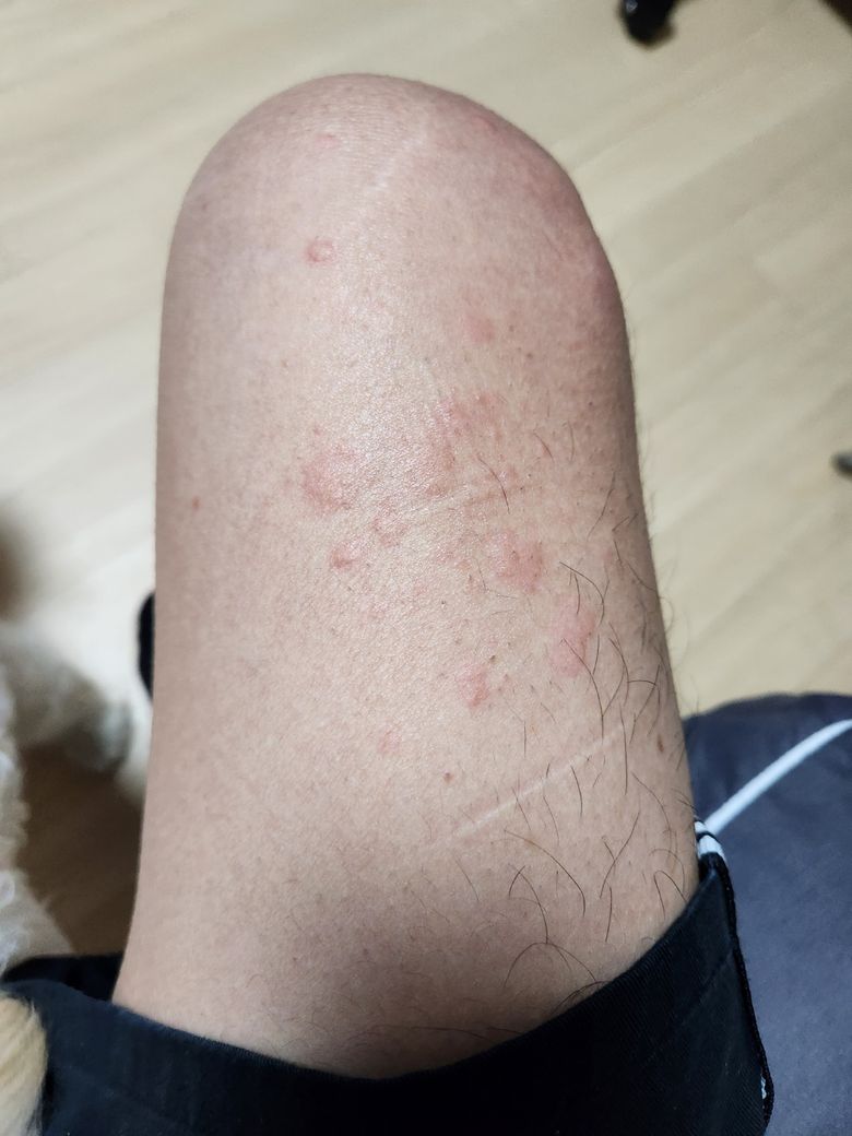 위 사진은 두드러기가 딱 봐도 다리 쪽에 많이 올라왔고 모기에 물린것처럼 엄청 가렵더라구요.