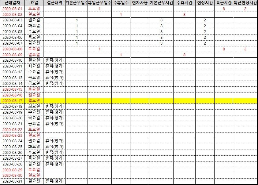 휴직(병가) 기간 중에 노란색으로 표시한 8/17(월) 대체공휴일이 껴있는데