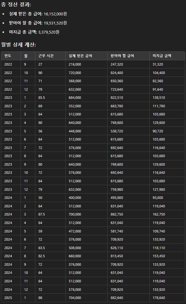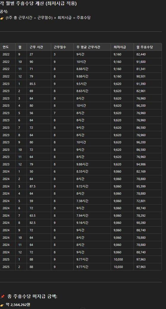 아르바이트를 하면서 최저시급, 주휴수당, 퇴직금을 제대로 받지 못해 직접 계산을 해보았는데, 정확한지 확인이 필요합니다.