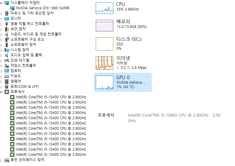 그런데 한대에는 작업관리자에 보면 GPU0이 있고, 한대에는 GPU0이 없습니다