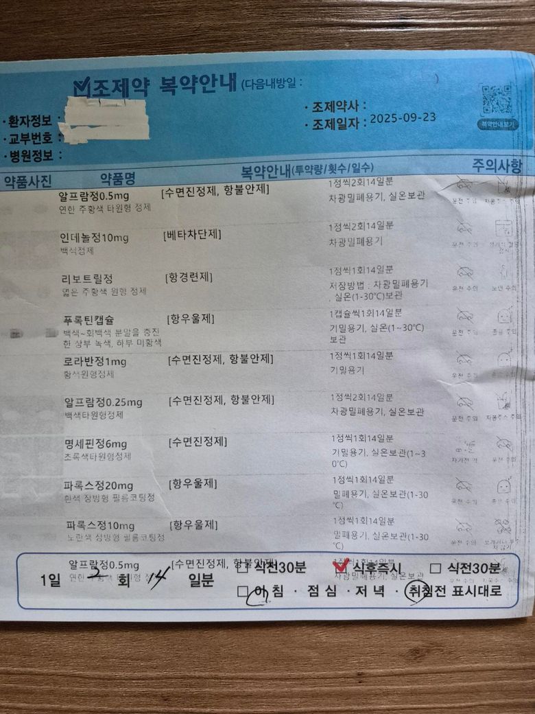 항우울제와 안정제 계열로 보시면 되는데요. 저 사진만 봤을 때는 아마도 필요시 복용하는 약들도 있지 않을까 싶긴하네요. 아마 쓰시다가 증상이 조절되면 약 갯수는 좀 줄어들 수 있습니다. 졸음이 있을 수 있으니 유의해주시고요.