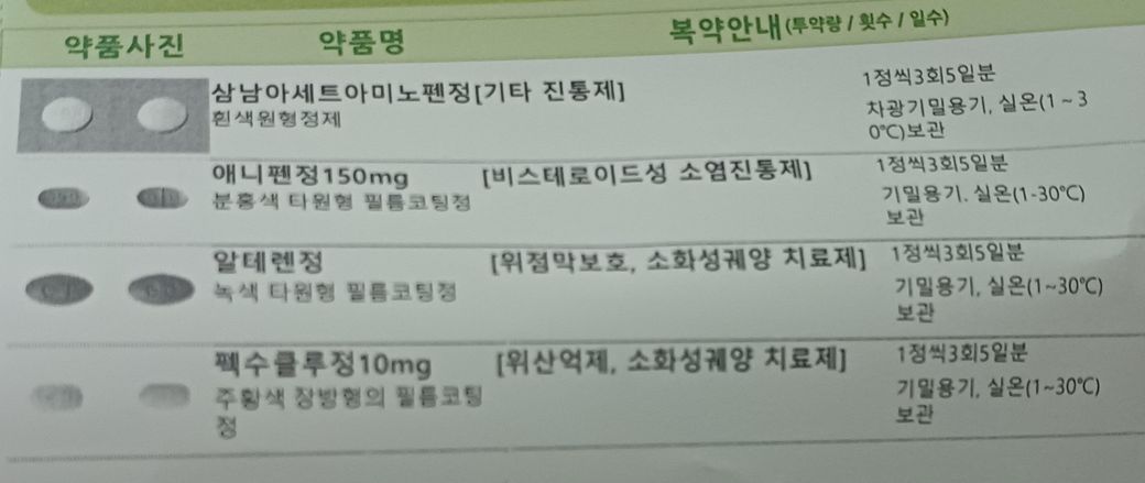 문의주신 사진의 처방약에 애니펜정이 이지엔과 중복이 되기에 추가로 함께는 복용하지 않길 권장드립니다.