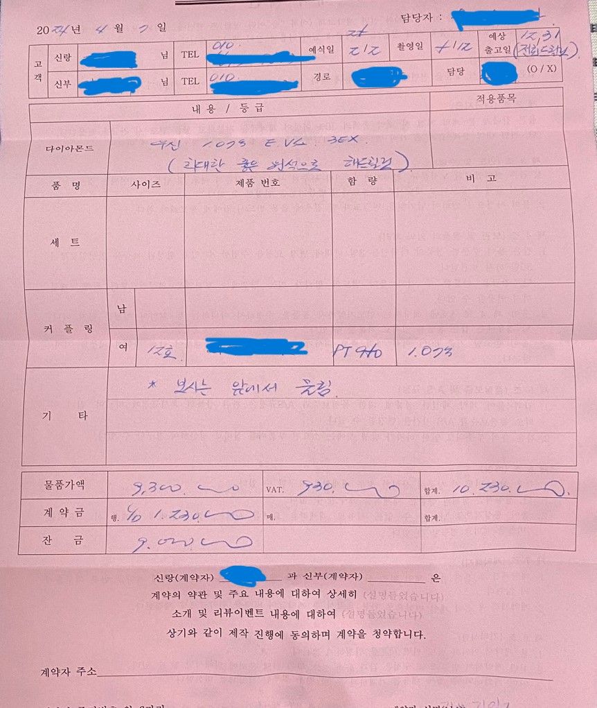 24년 4월 7일 모 업체에서 1캐럿 다이아반지 계약서를 작성하며 계약금 123만원을 카드결제 하고 왔습니다.