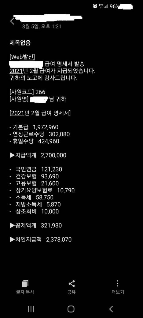 현장 직장에서 받고 있는 급여 명세서입니다.(6년차 입니다.)