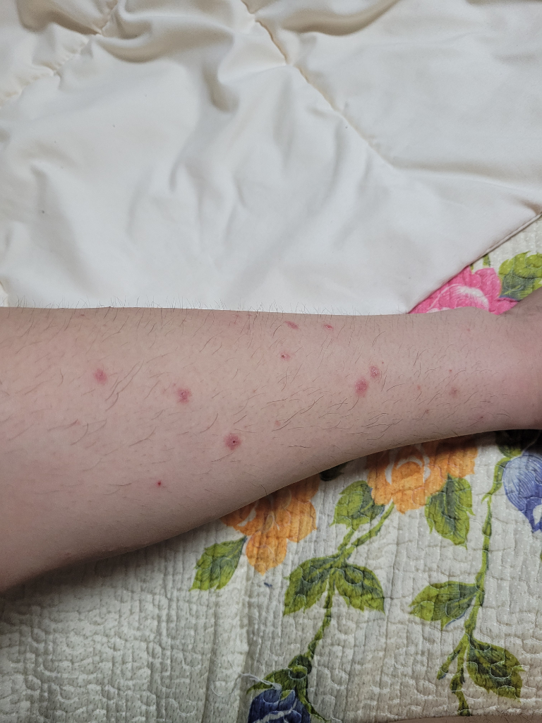 알레르기 증상 또는 피부염증의 가능성이 생각됩니다. 2번째 사진은 염증성 병변이 좀더 뚜렷해 보입니다. 긁을시 감염의 위험성이 있으므로 긁지 마시고 찬 물수건을 사용한 냉찜질과 약국에서 항히스타민제를 구입해서 복용하시고 피부과 진찰을 받기 바랍니다.