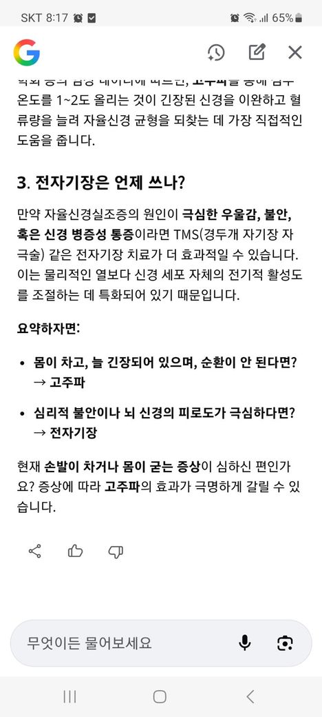 따라서 “몸이 차면 초고주파, 불안하면 전자기장”처럼 단순 분류하는 것은 과도한 일반화에 가깝습니다. 실제 치료 선택은 1) 수면의 질, 2) 우울·불안 동반 여부, 3) 갑상선·빈혈·수면무호흡 등 기질적 원인 배제, 4) 운동·스트레스 상태 평가가 우선입니다.