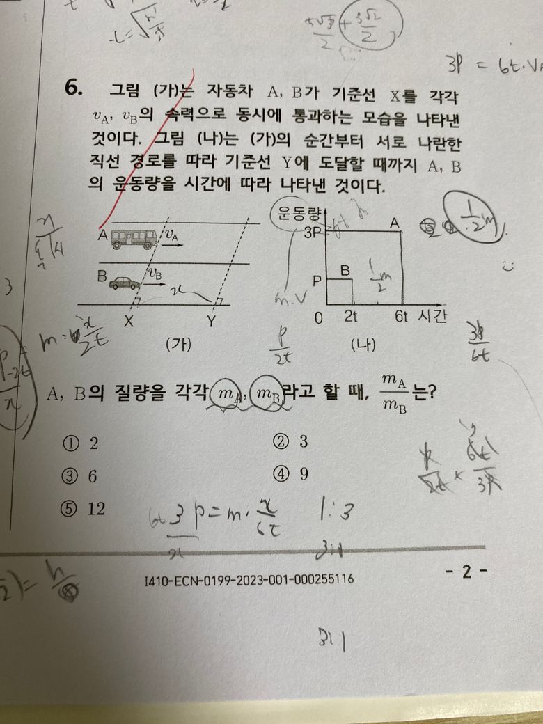 A의 속력은 B보다 3배 느린데, A의 운동량은 B보다 3배 큽니다. 그럼 질량은 A가 B보다 9배가 큰 것이지요.