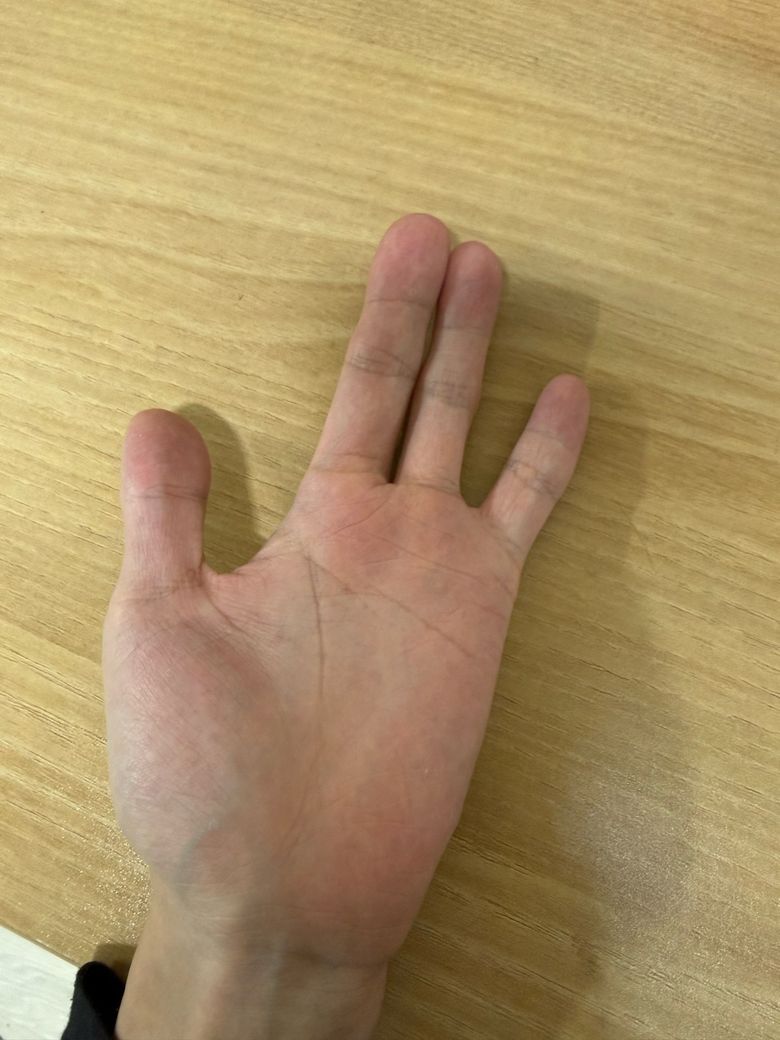 좌측 손 악력이 우측 대비 절반 이하로 느껴질 정도로 약하고, 손바닥 아치가 무너진 형태로 수부 구조 변형도 동반되어 있습니다.