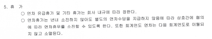 일단 계약 시 아래와 같이 연차는 이월이 불가하다는 조항이 있었으나 대휴 관련해서는 소멸된다는 내용이 없는 상황입니다. 더불어 회사 경영팀에 확인해 보니 연차는 실 입사일 기준으로 1년이 되는 날 소멸된다고 하더라고요. 단 연차사용촉진제도를 진행하지 않았습니다.