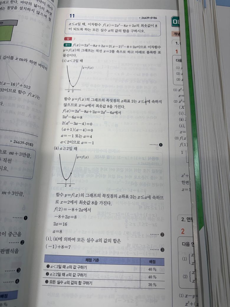 즉 a 값이 어디 있느냐에 따라 최솟값을 계산하는 식 자체가 달라지기 때문에 두 경우로 나눠서 각각 풀어야 하는 거예요. 둘 중 어느 경우인지 미리 알 수 없으니 양쪽 다 구해보고 조건에 맞는 a를 모두 찾아 더한 게 정답이랍니다 :)