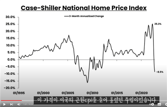 미국의 경우는 부동산이 CPI에 큰 영향을 주는 지표중의 하나입니다. 그렇기 때문에 위와 같은 주택가격지수의 폭락은 미국의 인플레이션 하락에도 긍정적인 영향을 주게 됩니다.하지만 질문자님의 말씀대로 급격한 하락은 경기침체를 동반할 수 있게 되는데 그 이유는 주택가격지수를 하락시킨 원인인 금리로 인해서입니다. 주택가격지수가 급격히 하락하려면 그에 상응하는 급격한 금리인상 조치가 동반되는 것이기 때문에 급격한 금리인상은 곧 소비자들의 소비심리를 급격하게 위축시키게 되는 원인이 됩니다. 그렇기 때문에 급격한 주택가격지수 하락[급격한 금리인상] -> 경기침체 로 이어지는 원인이 될 수 있습니다.