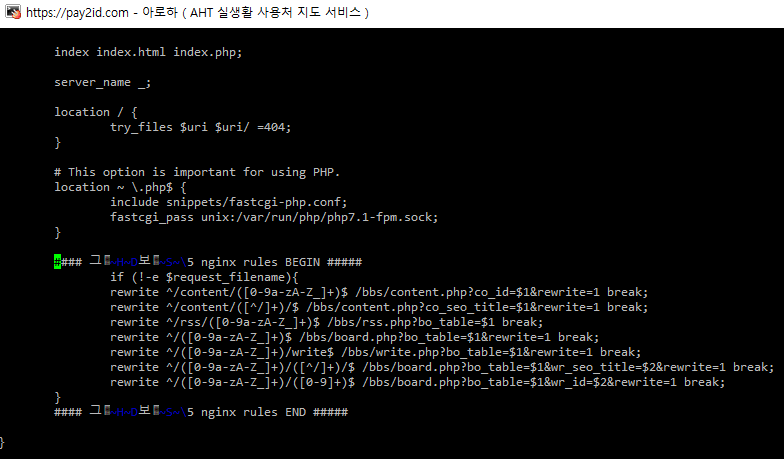 #### 그누보드5 nginx rules BEGIN ##### if (!-e $request_filename){ rewrite ^/content/([0-9a-zA-Z_]+)$ /bbs/content.php?co_id=$1&rewrite=1 break; rewrite ^/content/([^/]+)/$ /bbs/content.php?co_seo_title=$1&rewrite=1 break; rewrite ^/rss/([0-9a-zA-Z_]+)$ /bbs/rss.php?bo_table=$1 break; rewrite ^/([0-9a-zA-Z_]+)$ /bbs/board.php?bo_table=$1&rewrite=1 break; rewrite ^/([0-9a-zA-Z_]+)/write$ /bbs/write.php?bo_table=$1&rewrite=1 break; rewrite ^/([0-9a-zA-Z_]+)/([^/]+)/$ /bbs/board.php?bo_table=$1&wr_seo_title=$2&rewrite=1 break; rewrite ^/([0-9a-zA-Z_]+)/([0-9]+)$ /bbs/board.php?bo_table=$1&wr_id=$2&rewrite=1 break; } #### 그누보드5 nginx rules END #####