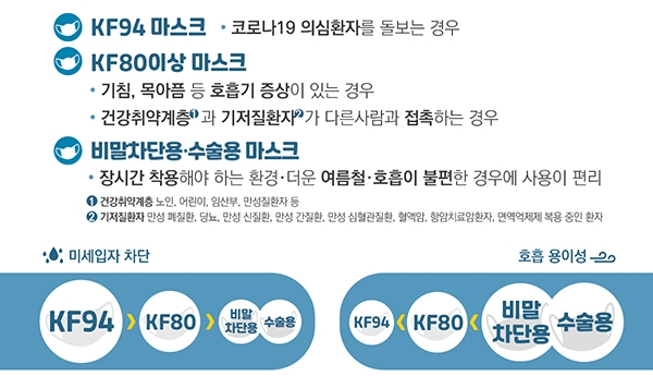 - 미세입자 차단은 KF94, KF80, 비말차단용·수술용 순으로 성능이 있고, 이와 반대로 호흡은 비말차단용·수술용, KF80 KF94 순으로 용이합니다.