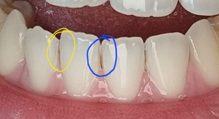 사진 흐려 명확히 말씀드리기 어려운점 양해부탁드립니다. 사진상으로는 노란색부분 우식 의심할 만한 부분 없거나 있더라도 정지우식정도로 보이며 파란 부분은 설측 사진이 있어야 명확히 알 수 있으리라 보입니다. 순측사진에서는 명확히 보이는 부분은 없어보입니다.