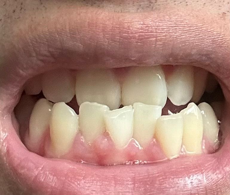 밑에 치아에 잇몸 튀축이 심한편인지 알고싶습니다 특히 송곳니 쪽에 잇몸 퇴축이 심한편인지 알고싶습니다 치아가 삐뚤한점 양해 부탁드립니다