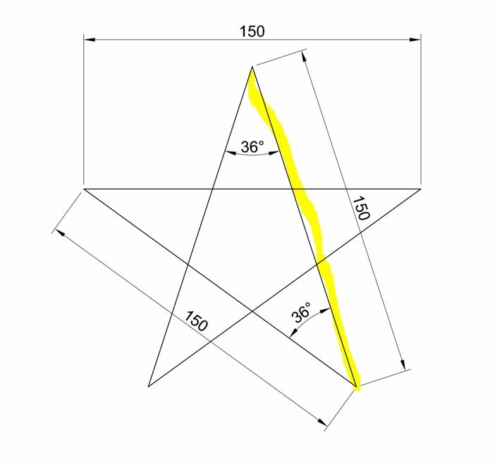 첫번째 별 그림의 노란색 거리는 150으로 주어졌고 양축을 기준으로 반시계 방향으로 90도에서 36도를 더합니다.