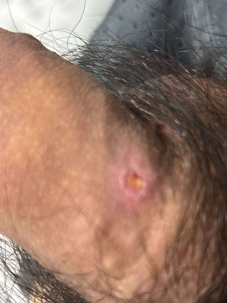 현재 사진은 단일 병변이며, 황색 농이 중심에 형성되어 있고 모낭 부위와 연관된 양상으로 보입니다. 이는 세균성 모낭염 또는 마찰 후 2차 감염에 더 부합합니다. 헤르페스에서는 보통 고름이 덩어리처럼 나오지는 않습니다.