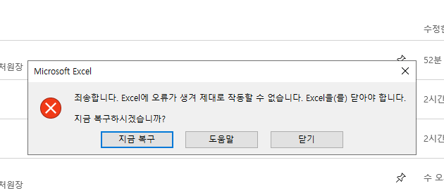 엑셀이 갑자기 실행을 하면은 저렇게 뜨고 복구를 눌러도 잠시 켜졌다가 계속 꺼지는데 어떻게 하면 될까요 ?