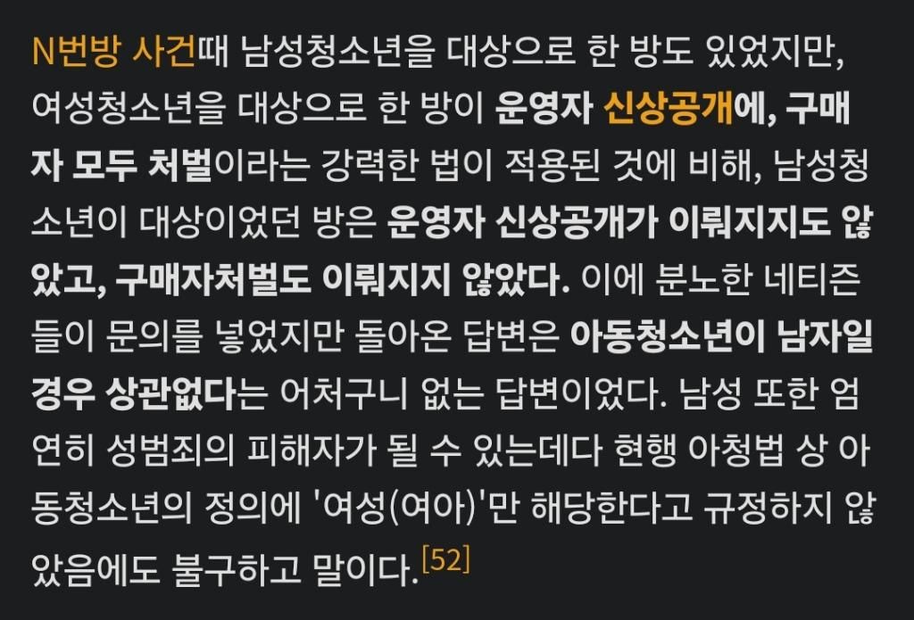 n번방 사건때 여성 청소년을 대상으로 한 방들만 운영자 신상공개에 구매자 모두 처벌을 하였는데