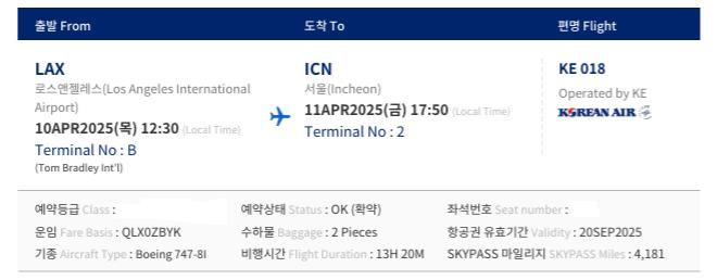 출발지는 LAX 도착지는 ICN 편명은 KE018 인데요..
