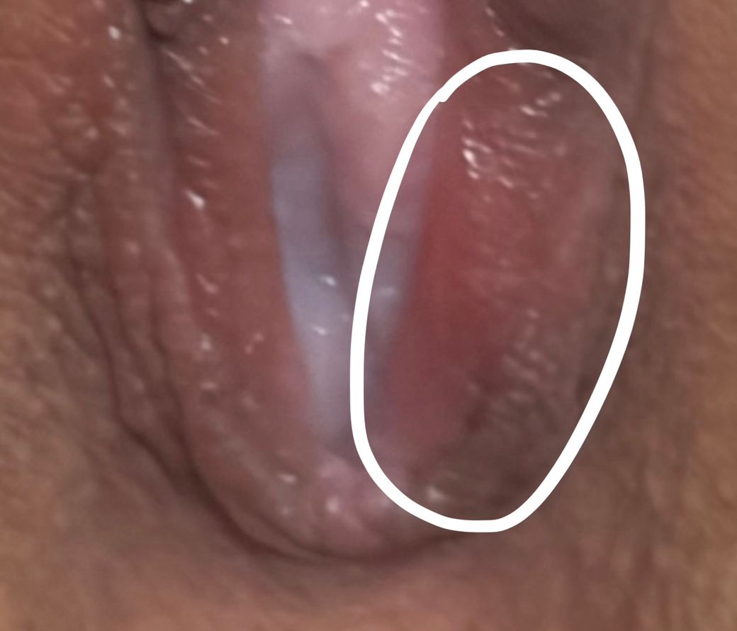 사진에서 확인되는 소견은 외음부 입구 부위의 발적(홍반)과 경미한 부종이며, 표재성 미란처럼 보이는 부분도 일부 관찰됩니다. 수포나 궤양, 분비물은 사진상 명확히 보이지 않습니다.