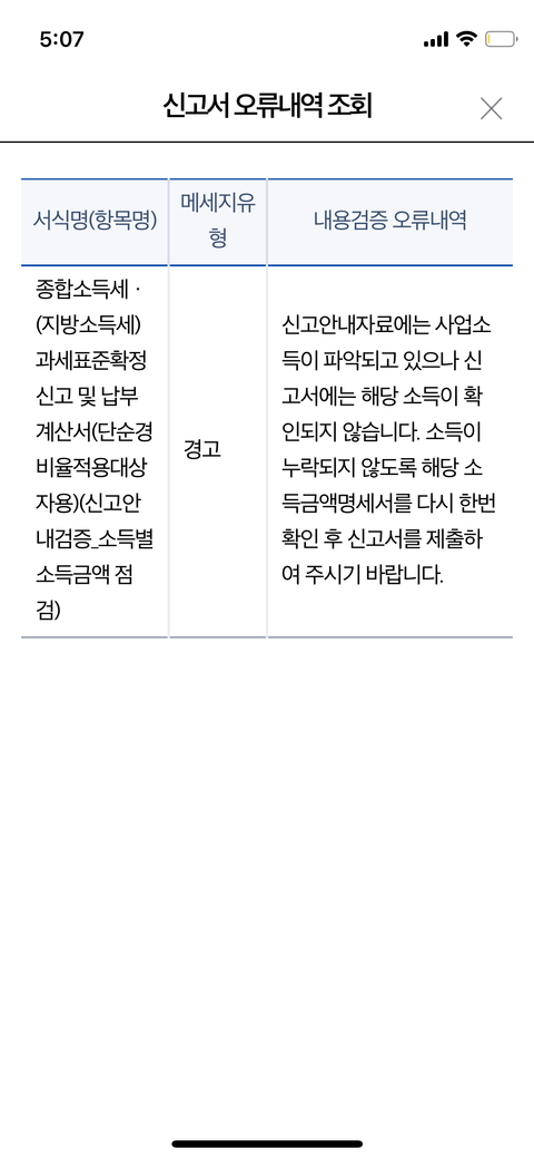 종합소득세 관련 문의 드립니다. 제가 종합소득세 신고하려고 소득금액증명서를 발급 받고 종합소득세 신고를 하는데 계속 내용검증 오류내역에 이런 내용이 떠요. 제가 작년에 알바로 일한 곳 중 한 업장이 소득금액증명서에 기재되어 있지 않는데 혹시 그거 때문일까요? 만약 그렇다면 어떻게 해야하나요? (참고로 기재되어 있지 않는 업장에서는 3.3% 프리랜서 세금을 공제해왔습니다. 급여명세서도 매월 꼬박 받고 제가 다 확인했구요.)