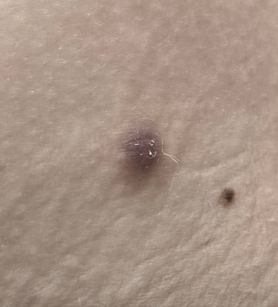 사진만 보고 정확한 진단을 하기는 어렵지만 피부섬유종(dermatofibroma)의 가능성이 커보입니다.