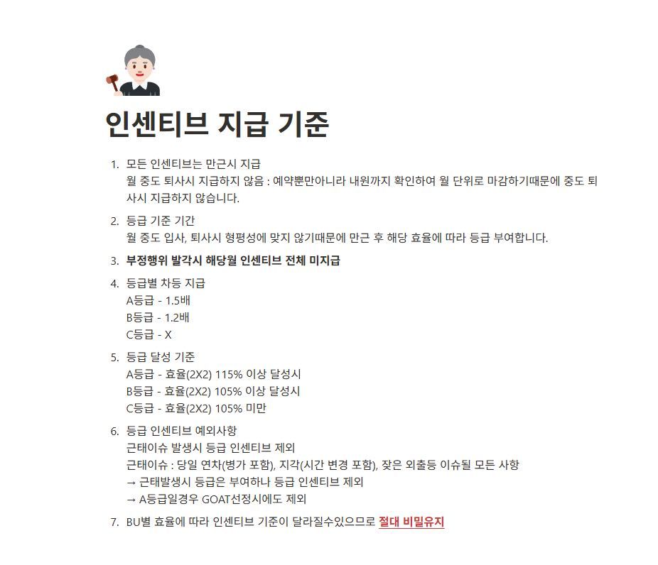 8월중 몸이 아파서 당일 연차를 사용 했습니다. 출근 시간전에 병원을 갔고 대기하는 사람들이 많아서 제시간에 출근이 어려워 사수에게 미리 연락했고 컴펌 후 당일 연차 사용, 병원 방문 서류도 제출 했습니다. 참고로 저는 실적에 따라서 매달 인센티브를 받는데 당일연차 사용시에도, 그 이후에도 회사는 아무말도 없었다가 8월 A등급으로 마무리 이후 9.1인 오늘 8월에 당일 연차를 써서 인센을 줄 수 없다는 말을 전달 받았습니다. 당일연차시 인센이 없다는 사항은 저 포함 다른 팀원들, 사수분도 알지 못하는 내용이었는데 해당 내용이 어디 있는지 문의하자 위 사진과 같이 회사채널에 있는 내용을 전달 받았습니다. 해당 회사에 근무 하면서 연차 제한은 아주 자주 있었던 일입니다.(월요일 연차 제한, 광복절 휴무 해당 주 토요일 전원 출근+해당주 연차1명만 가능, 연차 보고 다 올리고 인원 부족이라고 해당 월 연차 전체 반려 등등) 이런 상황에서 제가 열심히 해서 받는 인센티브를 정말 받을 수 없는지 궁금합니다.