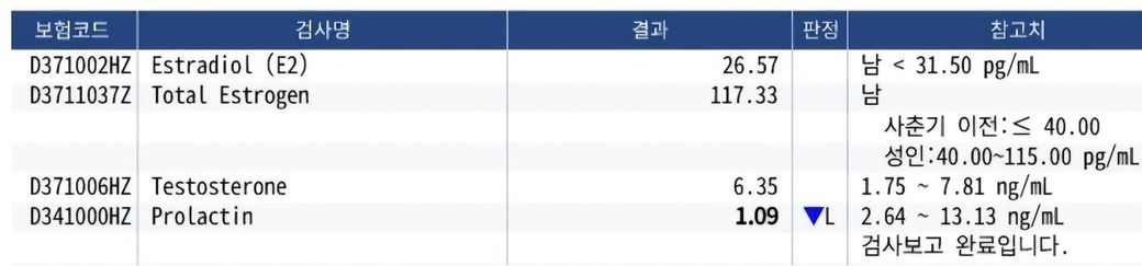 E2는 그래도 남성 참고치 안에 들어와있는데 토탈 에스트로겐이 높게 나오는것으로 보입니다. 남성에서도 에스트로겐이 나올 수 있는 요인이 있는데 바로 지방입니다. 지방 세포는 안드로겐을 에스트론(E1)으로 바꾸는 작용을 하면서 여성 호르몬 수치를 높일 수 있습니다. 만약 본인이 지방이 어느정도 있는 몸이라면 지방을 뺴는게(운동, 탄수화물 줄이기) 도움이 될 수 있겠습니다. 참고하시기 바랍니다.