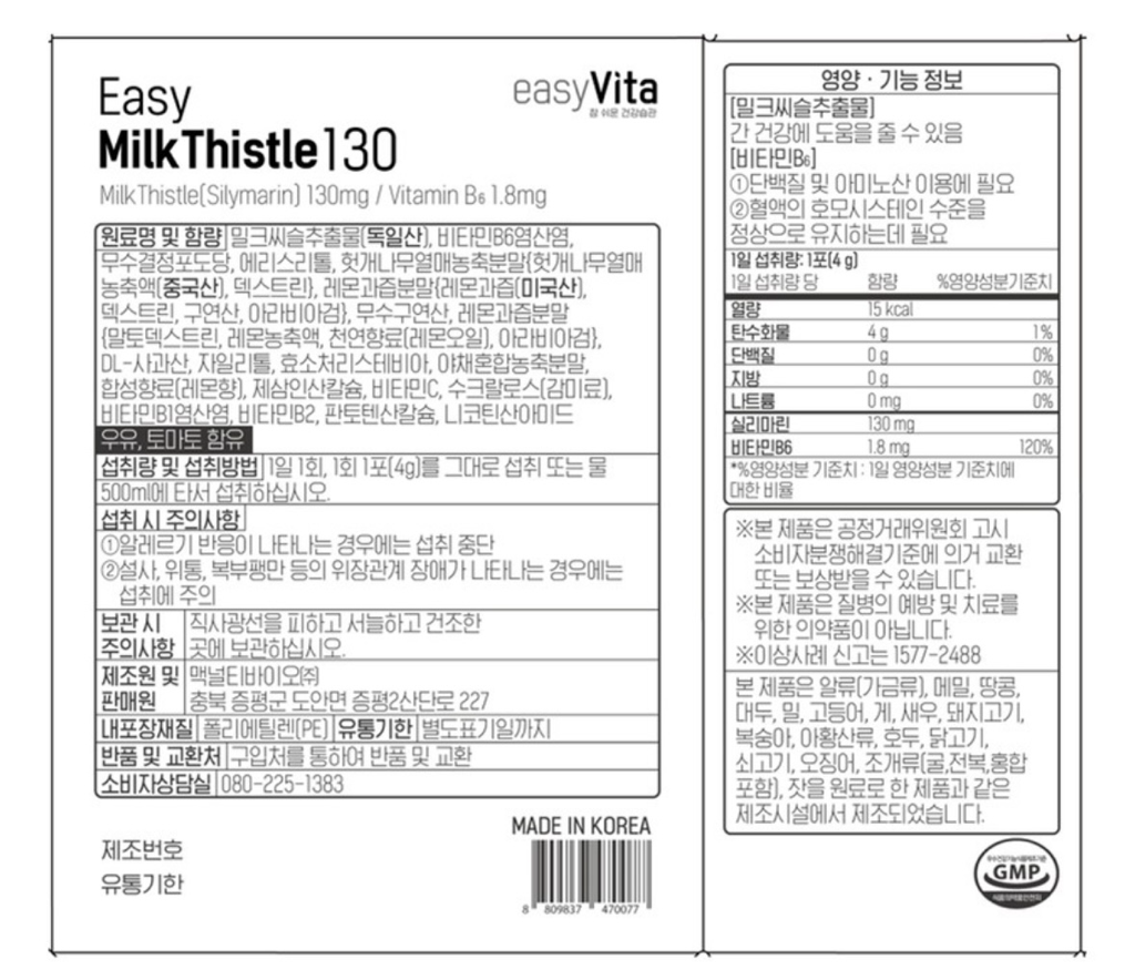 밀크씨슬에 함유된 실리마린의 함량이 중요한데, 현재 성분표에는 밀크씨슬과 실리마린 중 어떤 것이 130mg이 함유되어 있는 것인지 모호하게 표기되어 답변을 드리기 애매합니다.