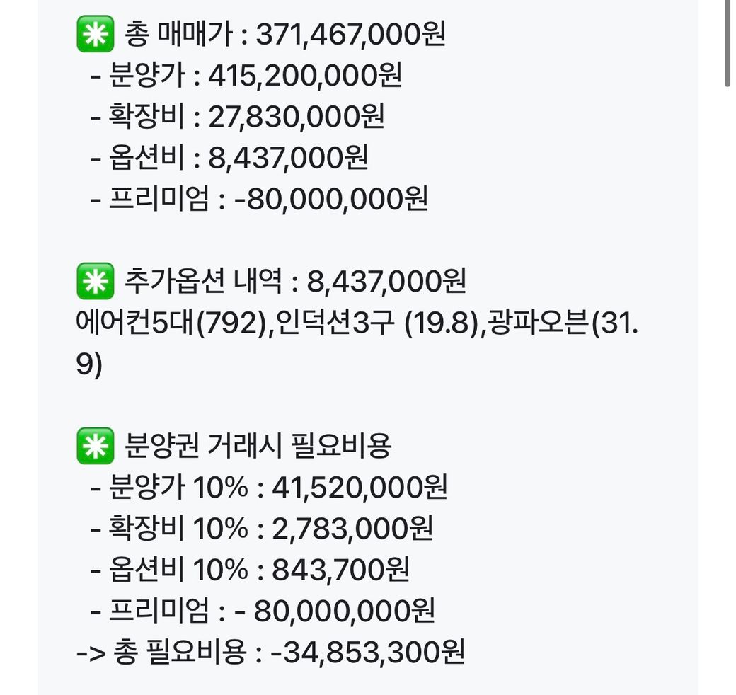 아파트 매매를 위해 보다보니 이해가 안가서 질문드립니다 사진 속에 총 매매가가 있고, 분양권 거래시 필요 비용이 있는데 여기서 총 필요비용이 -3,485만원정도인데 이 금액을 총 매매가에서 뺀 금액이 제가 매매할 금액인가요? 부동산에 여쭤보니 마이너스를 현금으로 돌려주는 건 어렵고 매매가에 어쩌고 하시던데 그게 -를 해준다는건지 어떻게 하겠다는 건지 이해가 안가서요ㅜㅜ