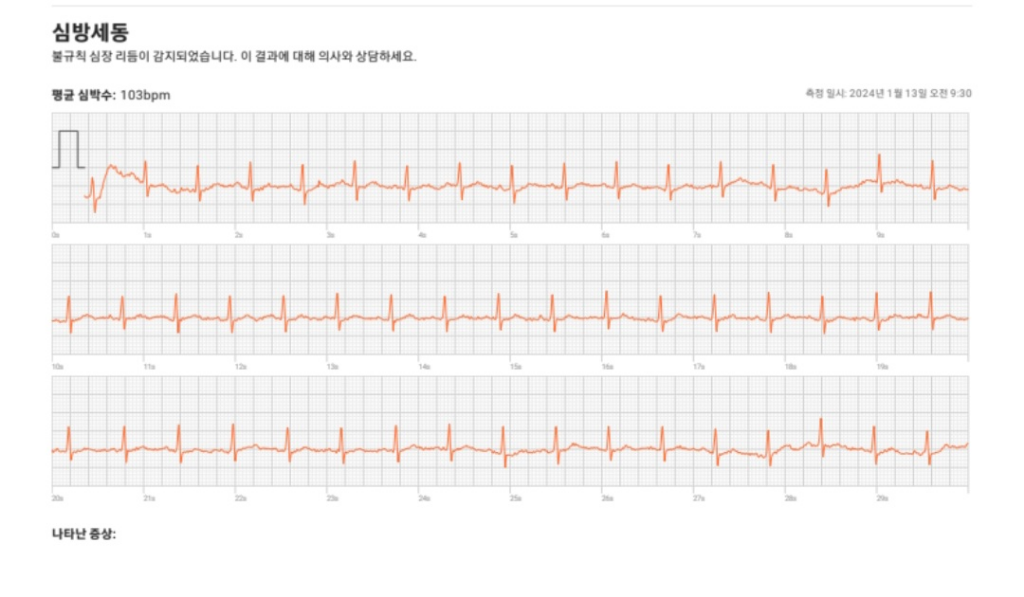 올려주신 워치 심전도에는 잡음이 너무 많아 정말 심방세동인지, 잡음인지 구분하기가 어렵습니다.