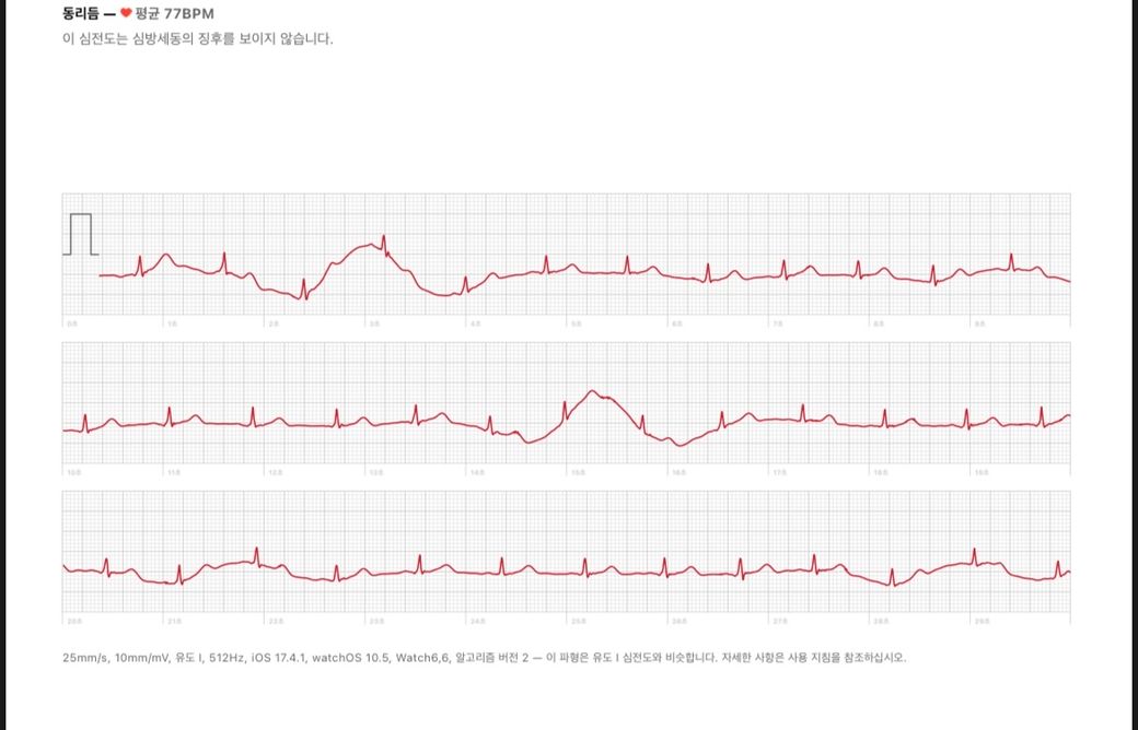 움직임에 의해서 기저 리듬이 위아래로 요동을 치는 부분이 있긴 합니다만 그것 외에는 특별한 이상 소견이 없어 보입니다. 맥박도 규칙적으로 뛰고 리듬 자체에도 큰 이상 소견이 보이지 않습니다. 그렇지만 애플워치 심전도를 아주 신뢰할 수는 없으며 의학적 판단을 하는 것에 있어 유의한 정보는 아닙니다.
