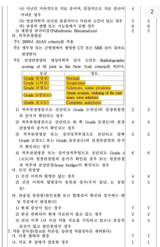 2) 척추관절병증으로 진단되고, 천장관절염증이 한쪽 관절이 경도인 경우에 4급으로, 천장관절염증이 양쪽 관절이 경도인 경우 5급으로 판정한다는 내용인지요?