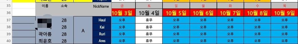영어 닉네임이있고 남녀가 섞여있고 휴무가 같고 A라는 카테고리로 묶여있는것을 보아 A조라는걸 알수있고 조별 교대 근무로 보입니다.