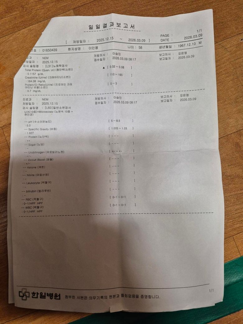 일반 소변검사에서도 단백은 음성으로 확인됩니다. 소변 pH는 5.0으로 정상 범위에 해당하며, 비중은 1.027로 약간 농축된 소변이지만 특별한 이상은 아닙니다. 또한 적혈구와 백혈구가 각각 0에서 1개 수준으로 보이며 이는 정상 범위에 해당하여 혈뇨나 염증을 의심할 소견도 없습니다.