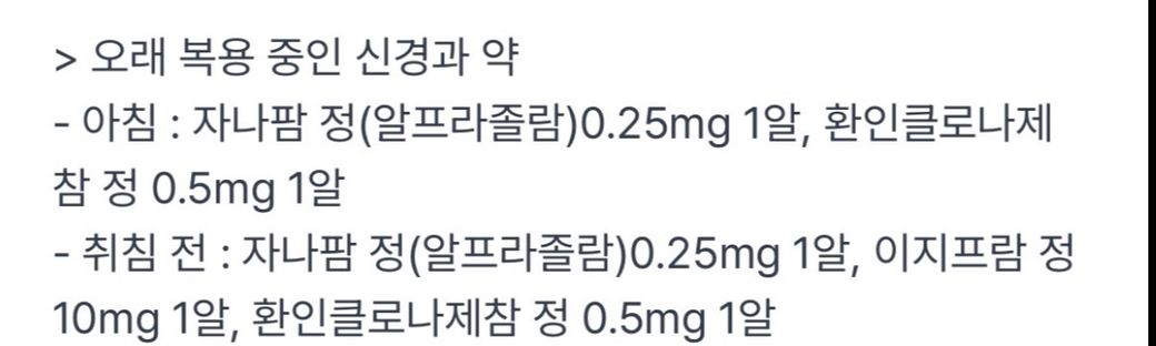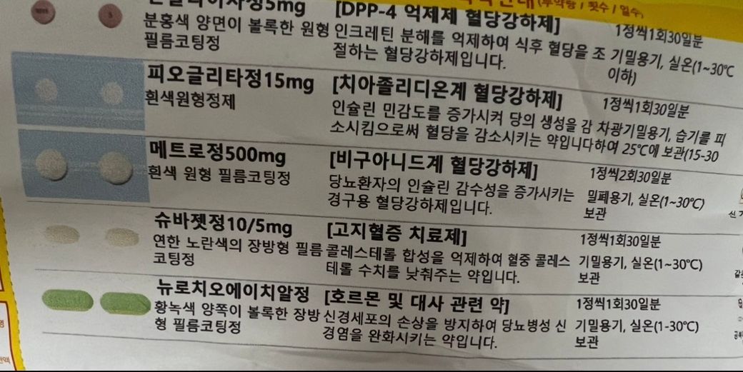 - 아침 : 식후 당뇨약, (우울증 공황장애)신경과 약,