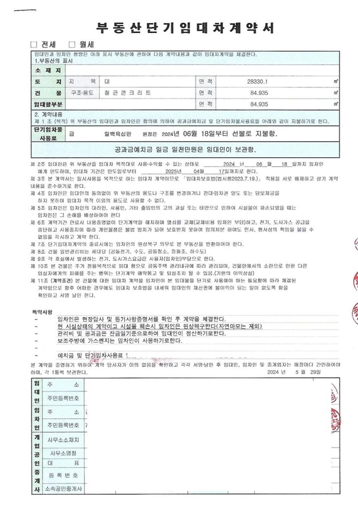 월세(임차료)는 선납조건으로 하는 "부동산단기임대차계약(1,000/160)"을 진행했습니다.