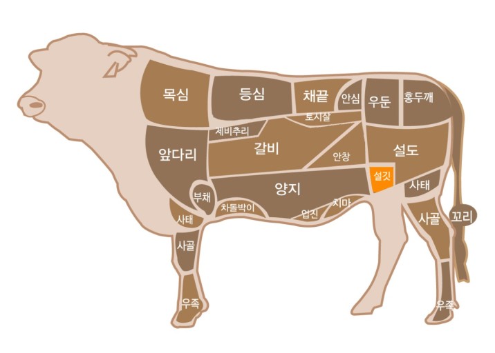 그림에서 보시는 대로 설깃머리살은 소의 뒷다리 바깥쪽 엉덩위 부위인 볼기에 위치해 있습니다.