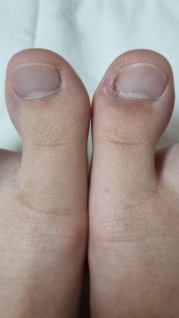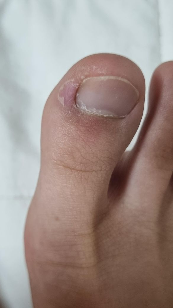 오른쪽 엄지발톱에 조갑주위염이 한달 반정도 전에 생겼었는데 집에서 고름 짜고 연고 바르면서 관리했고 약 이주일정도 전에 피부가 벗겨졌어요