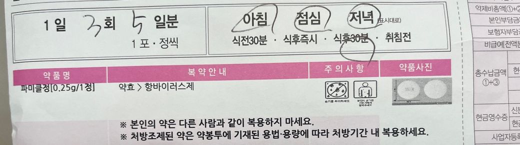 축녹증으로 항생제 4일정도 복용중이고, 추가로 입술 수포로 인해 항바이러스제도 처방받았습니다. 피부과 진료시 항생제 먹고있다고 알렸고,